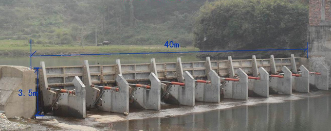 自动翻板坝,洪水漫顶20cm后,便自动翻板,河道行洪顺通,对保护农田将起到很大作用.